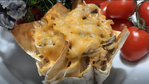 Жульен в корзиночках из лаваша. Праздничная подача жульена из куриного филе и вёшенки. Очень вкусно.