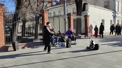 Уличные музыканты в Москве исполняют кавер в классической обработке под скрипку, барабаны и контрабас