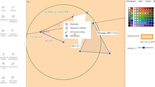 Какие обозначения объектов бывают, как их выбрать, как менять цвет и размер. GeoGebra 6.