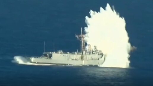 Уничтожение корабля крылатыми ракетами и торпедами.