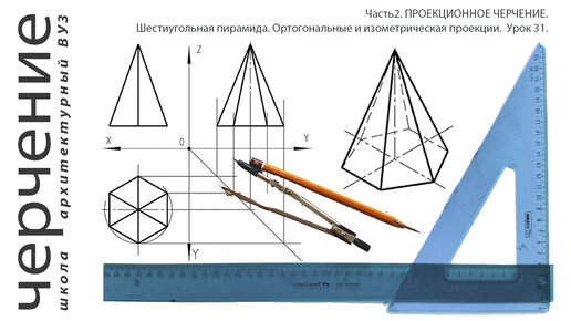 Шестиугольная пирамида. Ортогональные и изометрическая проекции. Урок 31. (ПРОЕКЦИОННОЕ ЧЕРЧЕНИЕ)