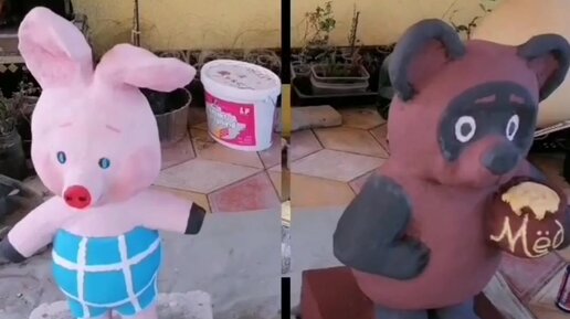 Винни Пух и Пятачок из цемента и мягких игрушек