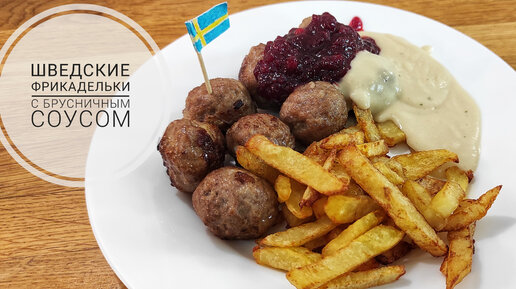 Шведские фрикадельки со сливочным и брусничным соусами и картофелем фри.