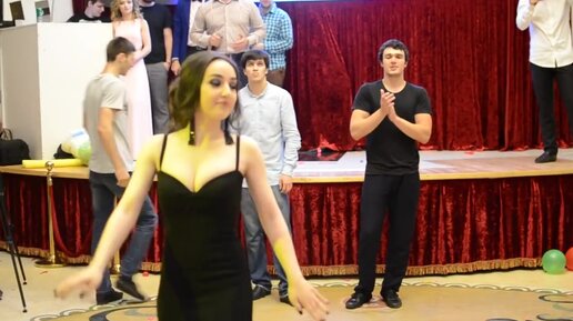Кавказская девушка с оголенной грудью танцует на свадьбе