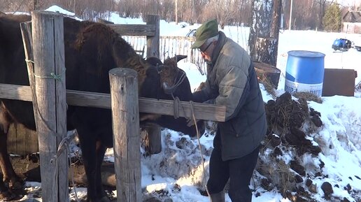 Лапуша стоит в станке для дойки. и Целуется с хозяином