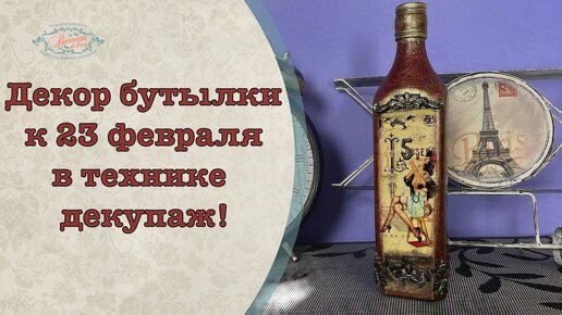 Бутылка любимого напитка в подарок к 23 февраля в технике декупаж