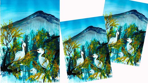Как нарисовать аистов в горах. Рисуем весенний пейзаж. Рисуем вербу.