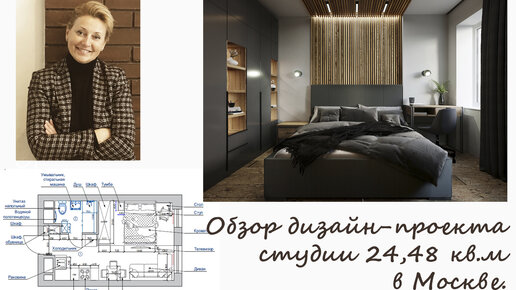 Обзор дизайн-проекта студии 24,48 кв.м для студента, в Москве.Кухня-гостиная, зона спальни с рабочим местом, душевая.