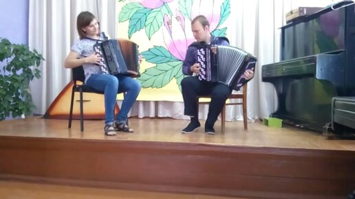 Играет дуэт баянистов: Лиана Садыкова и Павел Сивков. Звучат популярные, известный мелодии: "Цыганочка","Яблочко", "Коробейники"