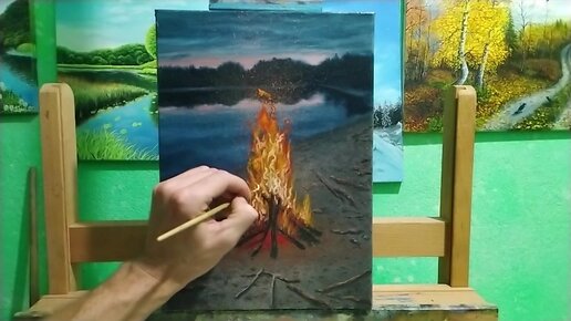 Как нарисовать костер маслом легко|как рисовать костер у реки|искры костра