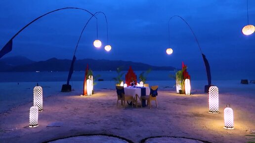 Романтик на пляже, по шум океана. Столик с белоснежной скатертью, мерцание свечей и холодное шампанское. Гили Эйр, Бали.