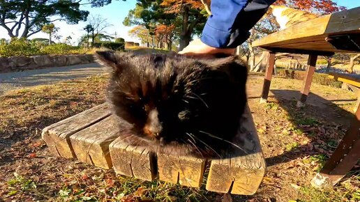 Бездомные кошки отдыхают на столах и лавочках в парке