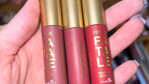 Свотчи на губах всех оттенков матовой помады Vivienne Sabo “Femme Fatale”