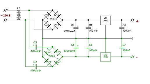 Двух полярный блок питания из трансформатора с одной вторичной обмоткой своими руками схема и плата.