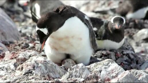 Субантарктический пингвин, или папуанский (Pygoscelis papua) пингвин высиживает яйцо