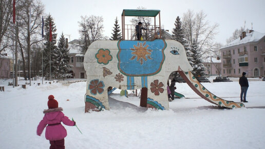 Дети катаются на площади с горки зимой | Похвистнево Семья Поляковых