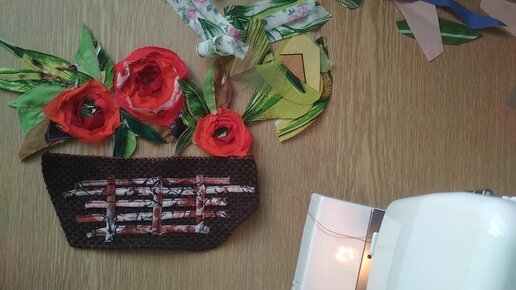 Корзинка и розы- придумала сама! ИЗ МЕЛКИХ ЛОСКУТОВ/ ТЕКСТИЛЬНАЯ ПИЦЦА/ для панно или как декор на сумку