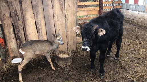 Теленок Кирюша и косулёнок Малыш кушают из одной кормушки