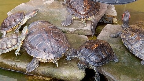 Встреча с черепахами в Ботаническом саду. Плавают. Обедают. Греются под лампой.