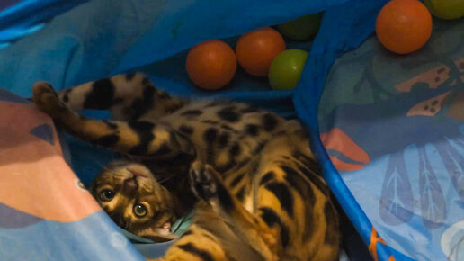Бенгальский котенок Жужа играет с игрушками и мячами в сухом бассейне