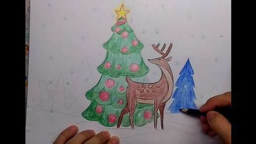 Как нарисовать оленя и елку, новогодний пейзаж \\ рисуем новый год карандашами