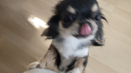 Собачка впервые попробовала рыбу, раньше питалась только сухим кормом.