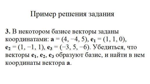 Убедиться, что векторы е1=(1, 1, 0), е2=(1,−1, 1), е3=(−3,5,−6) образуют базис, и найти координаты вектора а=(4,−4,5). пример 3.