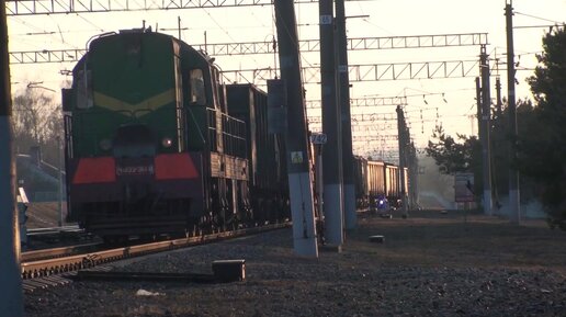 Тепловоз с вагонами прикрывает вид на электропоезд ЭПр