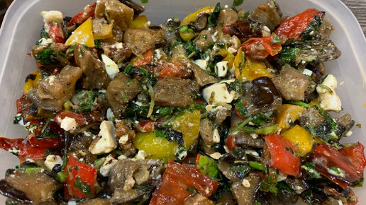 Тёплый салат из баклажанов, сладкого перца и брынзы.