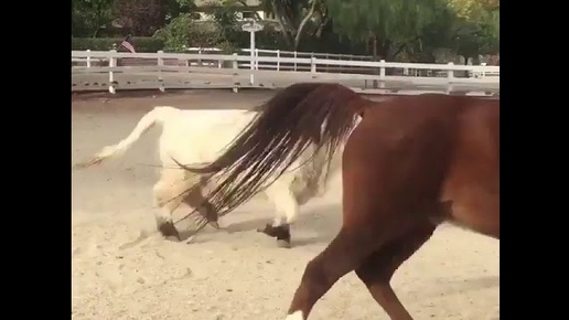 Лошадь играет с бычком.
