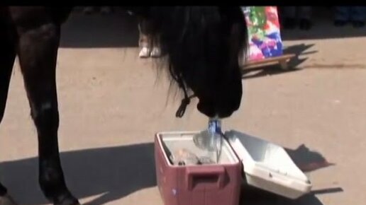 Лошадь подает бутылку и закрывает холодильник.