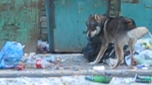 Бродячий пёс кормится.