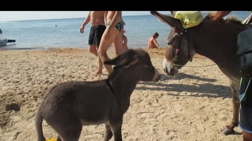 Ослиха и ее ослёнок на пляже.
