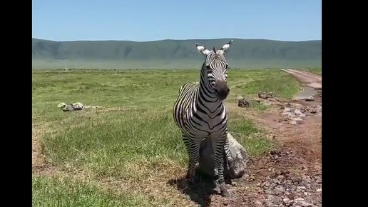 Зебра чешется о валун. Завидно даже, как хорошо ей.