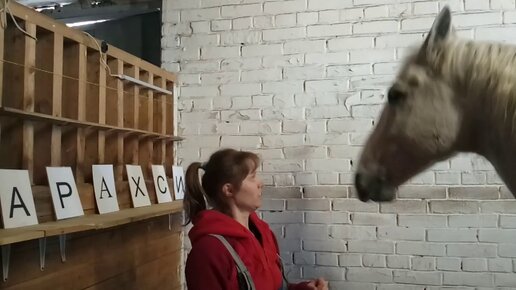 Лошадь складывает слово Сахар.The horse writes the word "Sugar".