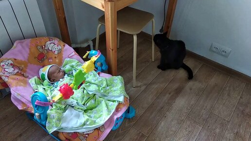 Первое знакомство дочки Нины и кошки Масяни.