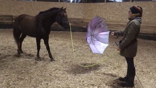 Когда у лошади устойчивая нервная система и ей первый раз показывают зонт.