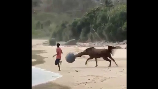 Лошадь играет в мяч на берегу моря
