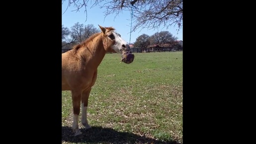 Развлечения для лошадей на пастбище. Мячики с сеном.