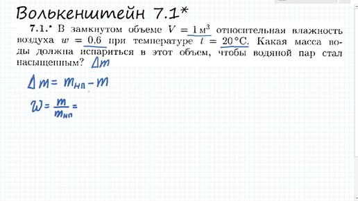 В замкнутом объеме V=1м^3 относительная влажность воздуха w=0,6: Волькенштейн 7.1