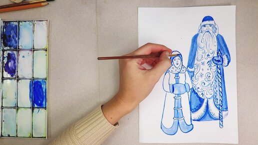 Рисуем Дед Мороза и Снегурочку гжельскими мотивами.