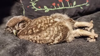 Самое милое видео. Маленькая сова укладывается спать. Сова спит на пузике, вытянув ножки