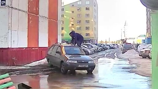 Русский Джеки Чан проехался верхом на авто соседа :)