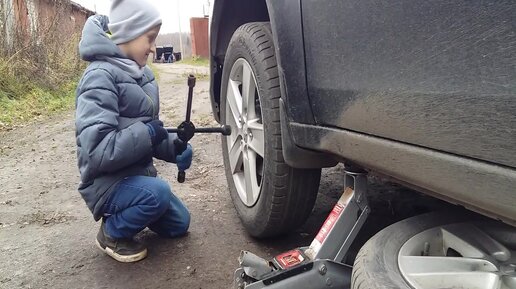 Замена колес. Готовим машину к зиме. Сын сам меняет колёса.