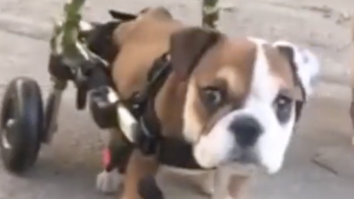 Бульдожка Велли родился с расщеплением позвоночника, поэтому вынужден передвигаться на маленькой коляске