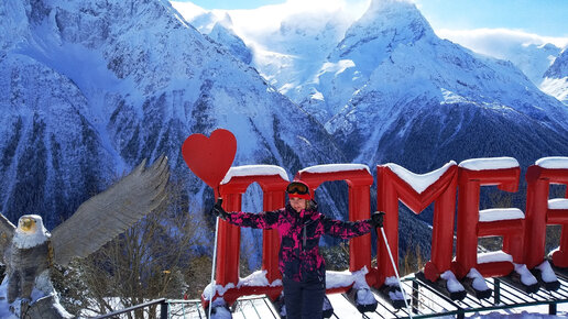 Катаемся на горных лыжах на Домбае. Отлична погода, захватывающие виды.