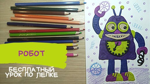Робот из пластилина. Как сделать робота из пластилина. Пластилин на картоне. Карандаши и краски.