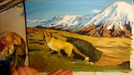 Лис в горах быстрое рисование гуашью