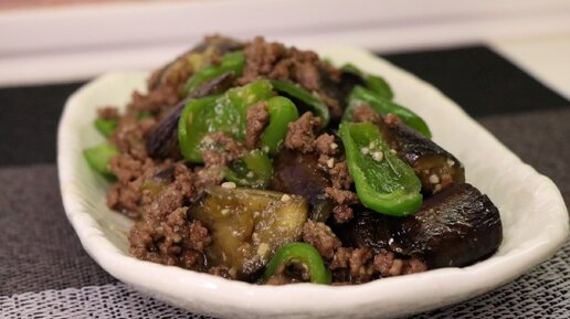 Баклажаны с мясом и зеленым перцем в соусе из мисо - пасты.