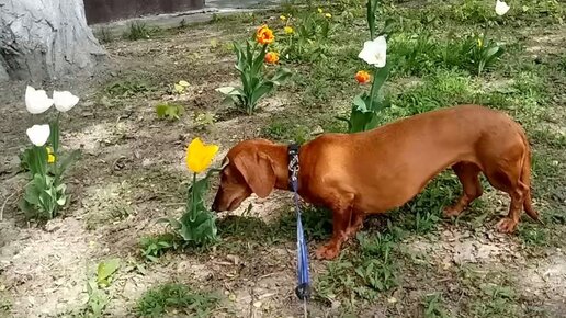 Ловим кошку, слушаем колокольный звон. Тюльпаны! Такса Соня гуляет